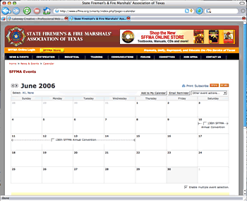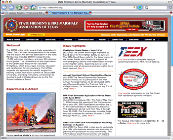 | The State Firemens and Fire Marshals' Association of Texas web site was redesigned and launched in April 2006. The new site features drop down menu navigation accessible from almost anywhere on the site, integration of advertisements on inside pages, an interactive calendar and forum community. |